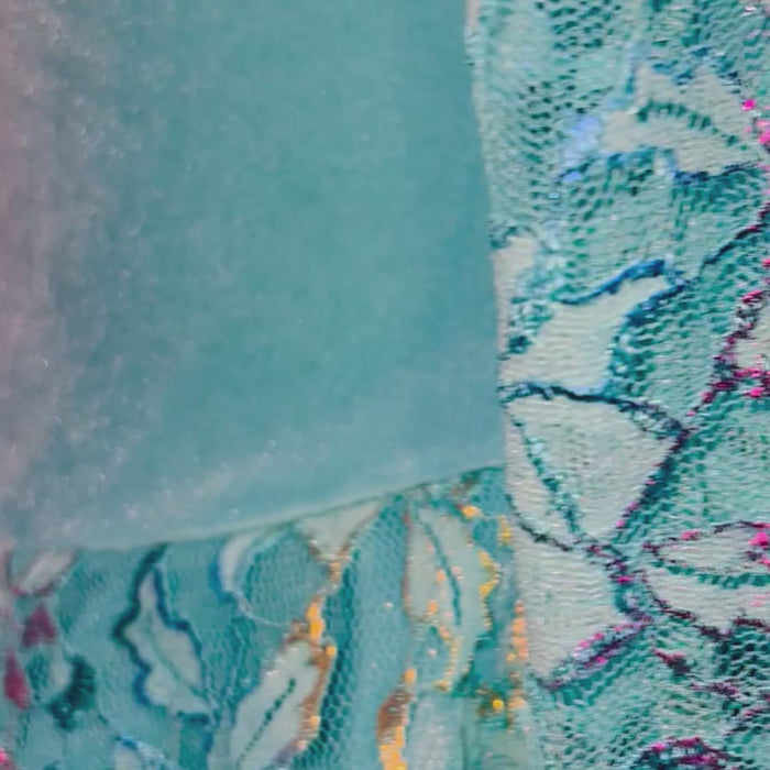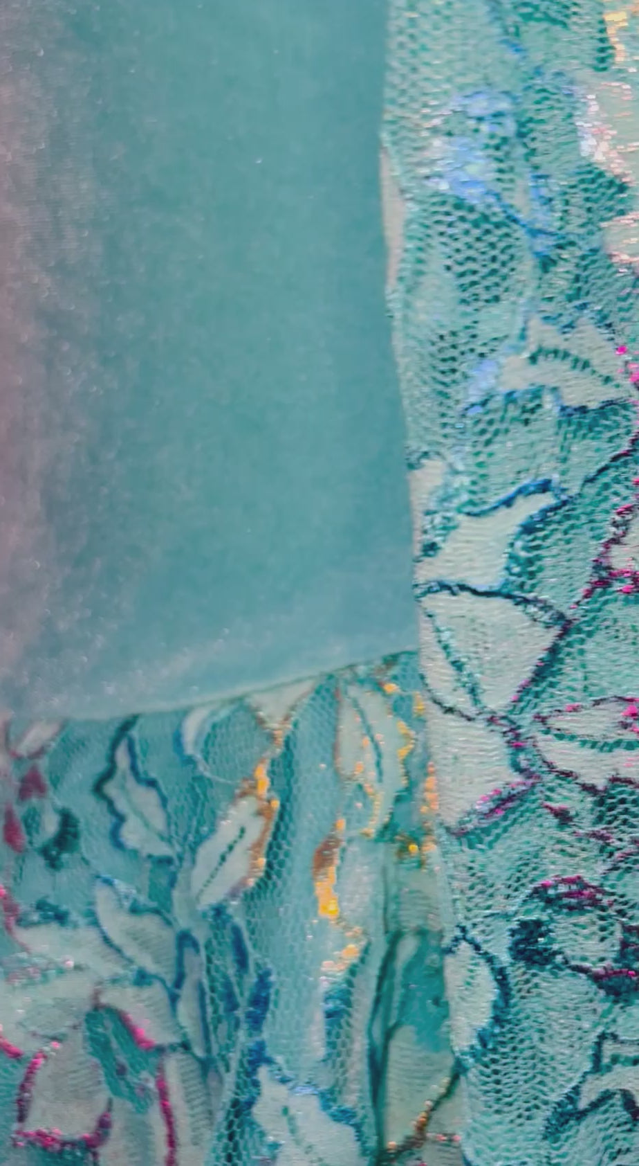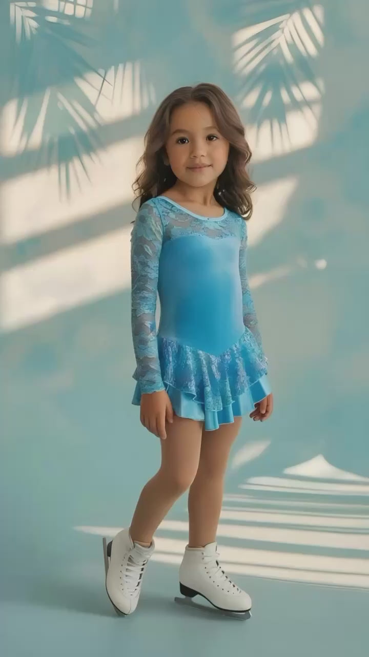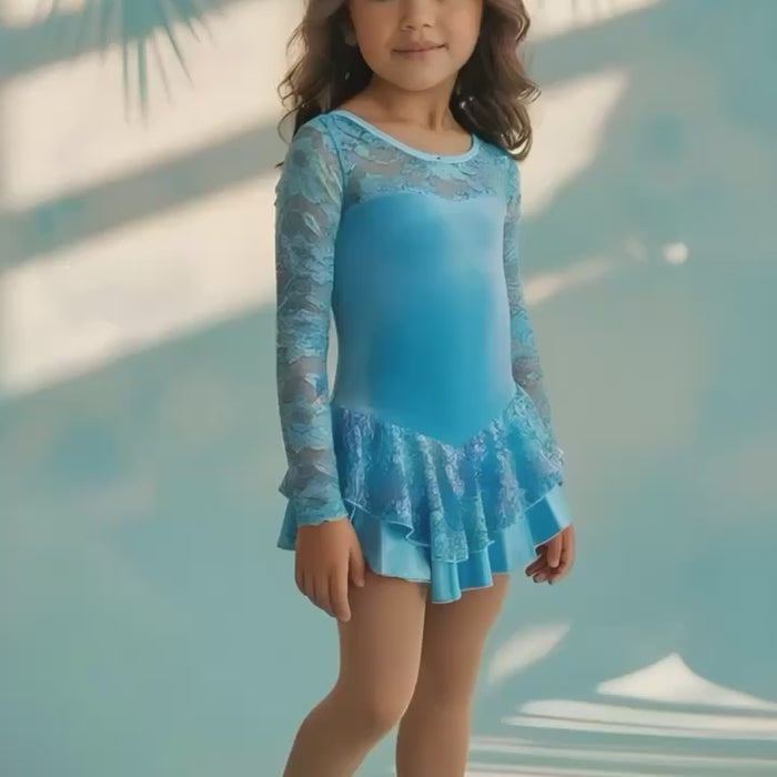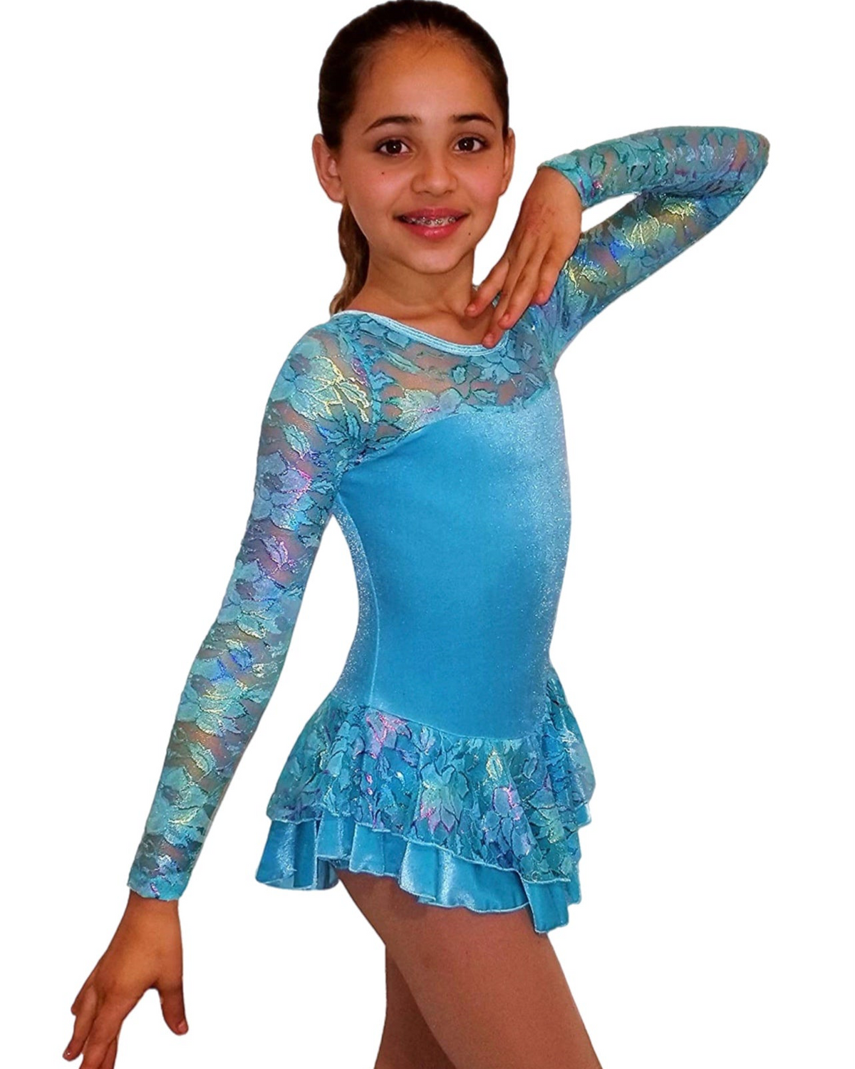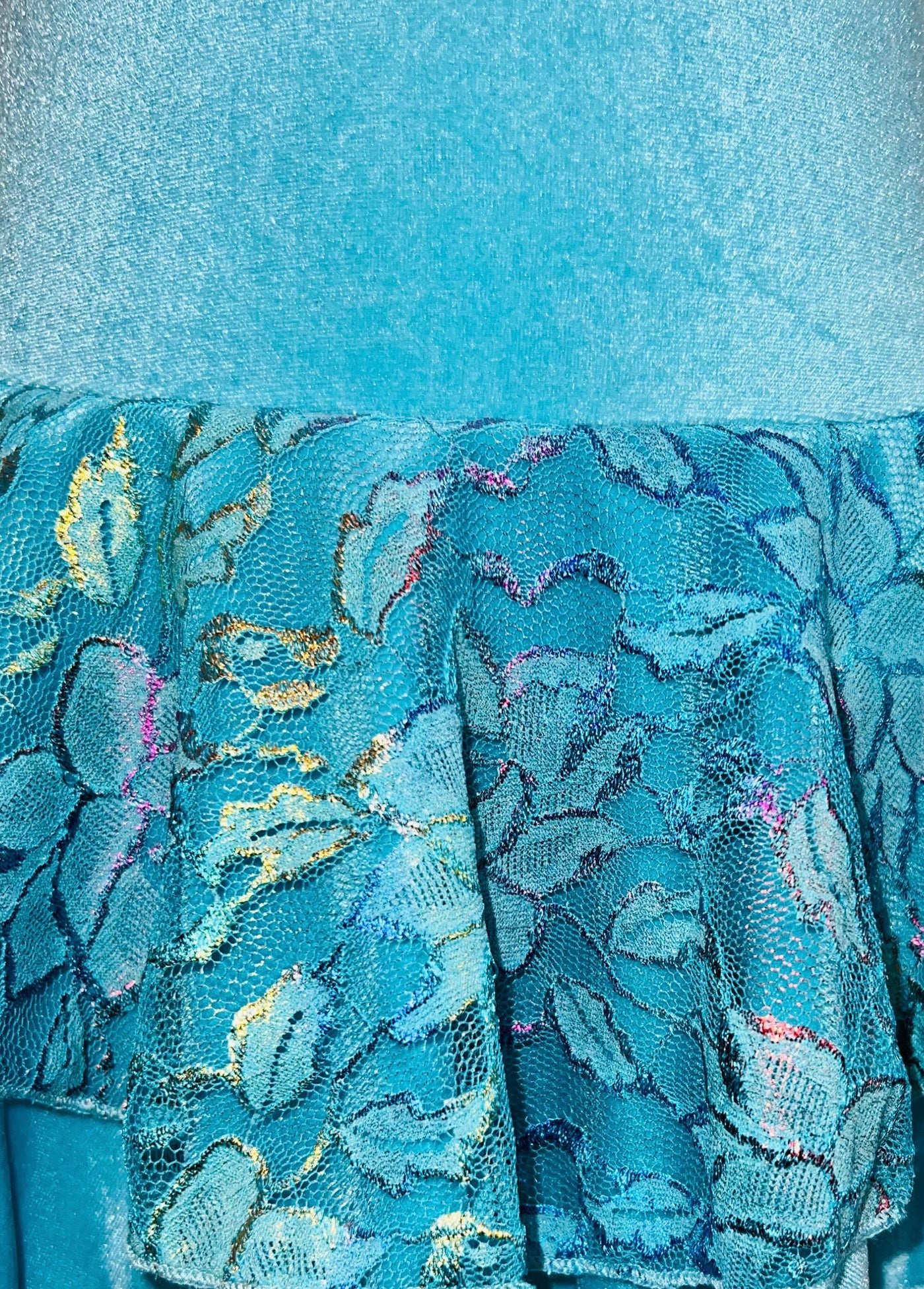 Crafted from luxurious velvet, this turquoise ice skating dress features long lace sleeves and a flowing twirling skirt, combining elegance with performance. The delicate lace adds sophistication while the soft velvet ensures warmth and comfort on the ice. Perfectly designed for seamless movement, this dress enhances your routine with both style and grace.