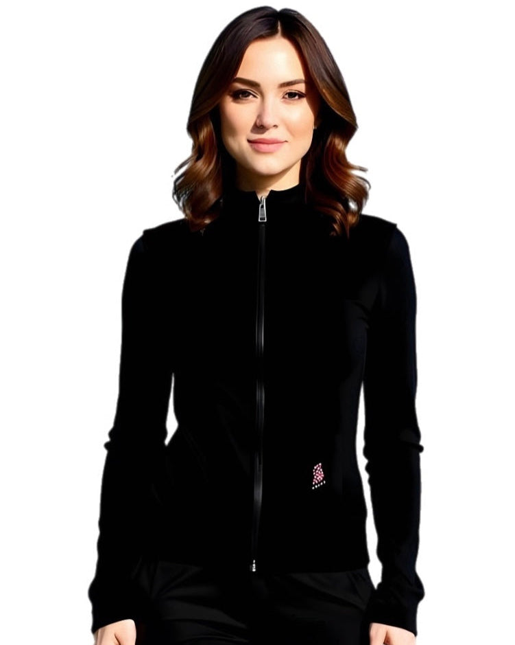 This fitted fleece power stretch jacket offers exceptional comfort and flexibility, ideal for active ice skaters. Featuring a stylish pair of skates rhinestone applique, it combines performance with elegant detailing. The jacket’s stretch fabric ensures a snug, supportive fit that moves with you, making it a perfect choice for training or casual wear on and off the ice.